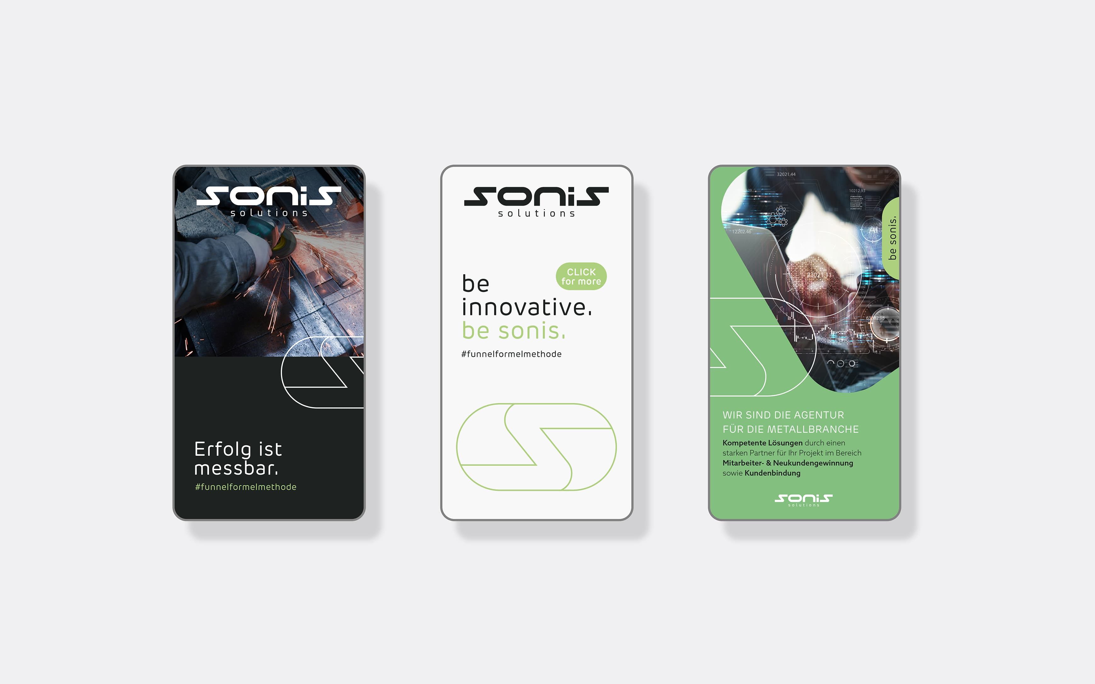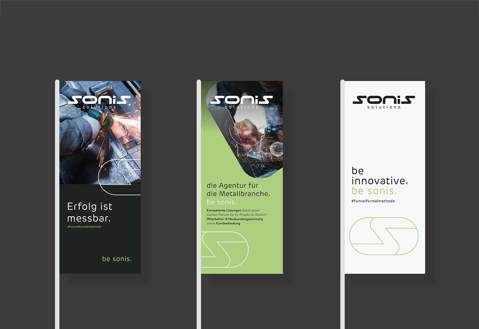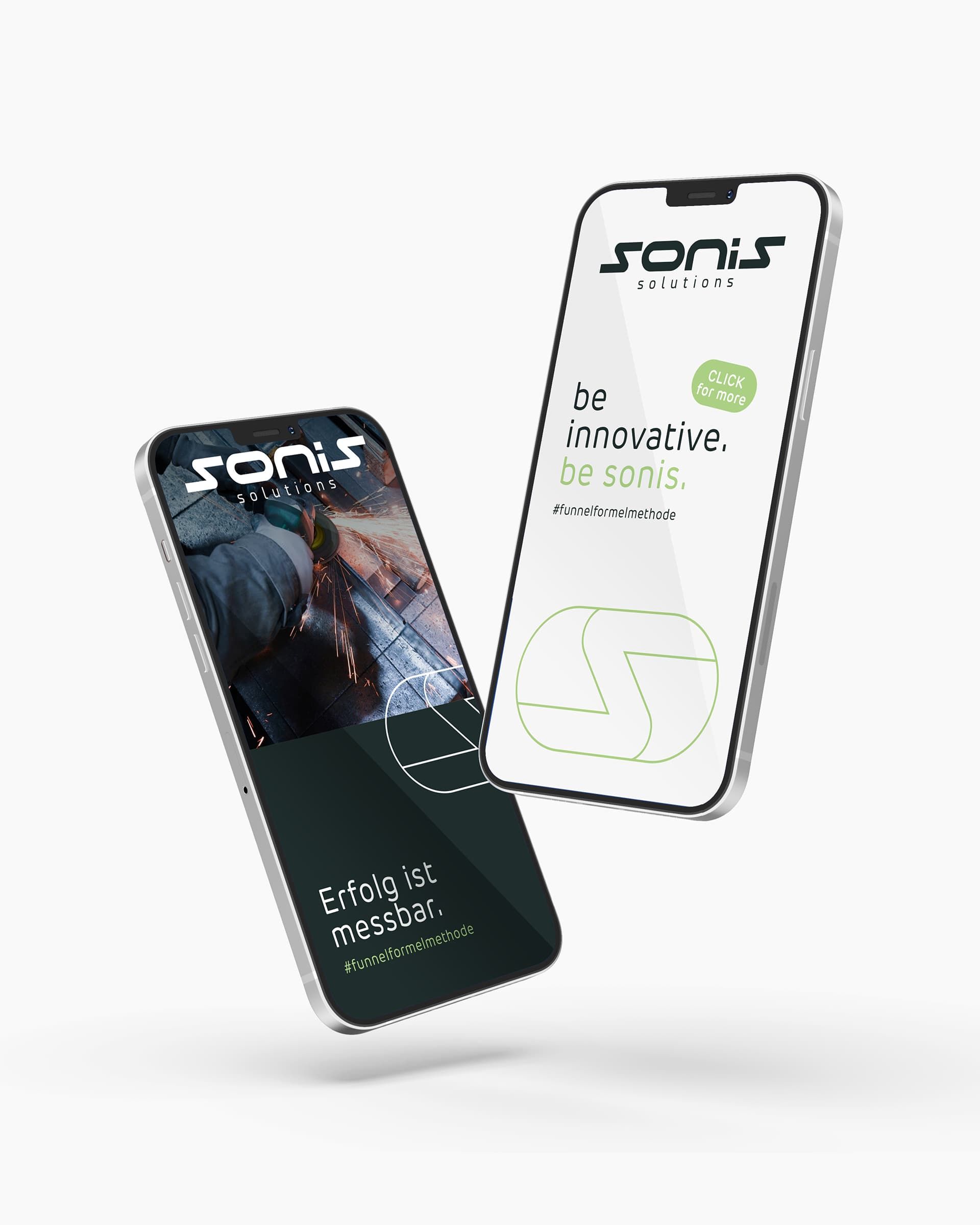 Sonis Solutions GmbH ist darauf spezialisiert, innovative und effektive Online-MarketingStrategien zu entwickeln, die Unternehmen dabei unterstützen, neue Kunden zu gewinnen und qualifizierte Talente zu rekrutieren. Wir haben eine klare, dynamische Lösung kreiert, die genau das mitbringt, was eine zukunftsweisende Marke können muss. Sie ist flexibel und beständig zugleich. In einer frischen, sachlichen Farbwelt zu Hause, lässt sie Spielraum für die stetig wandelnden Anforderungen in der Online-Marketing-Welt. Die bereits bestehenden Logos „Roland Sonnleitner“ und „funnelformel Methode“ wurden in die neue Struktur und Optik aufgenommen und integrieren sich durch ein minimales fresh-up in das Gesamtkonzept. In Zusammenarbeit mit dem Kunden haben wir den Claim „be sonis“ erarbeitet. Sei laut. Sei sichtbar.